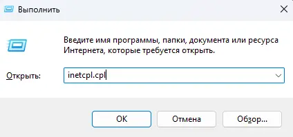 2. Введите команду `inetcpl.cpl` и нажмите Enter. Откроется окно «Свойства: Интернет».