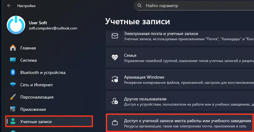 1. Откройте «Параметры» (Win + I) -> Учетные записи -> Доступ к учетной записи места работы или учебного заведения.