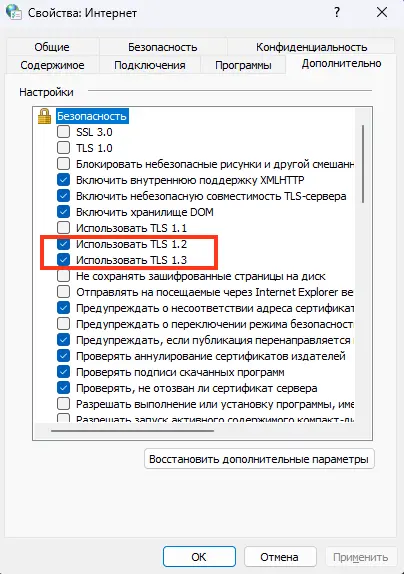 6. Убедитесь, что галочки напротив устаревших SSL 3.0, TLS 1.0 и TLS 1.1 сняты (или их наличие не мешает, если включен 1.2, но лучше отключить старые для безопасности).