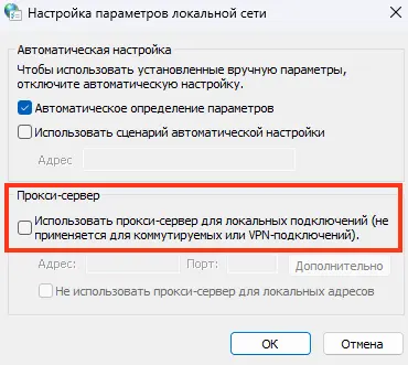 4. Убедитесь, что галочка «Использовать прокси-сервер…» снята.