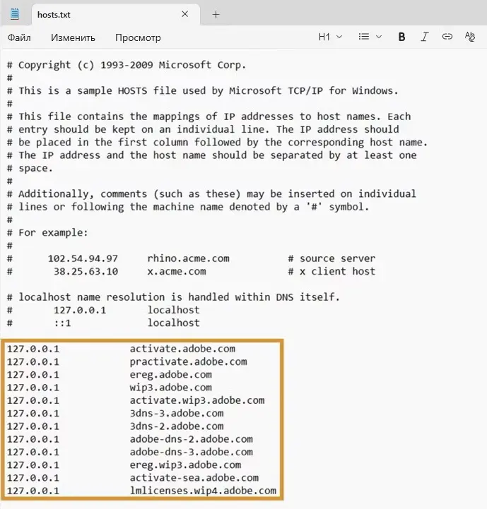 Если вы видите там строки, содержащие adobe.io или adobe.com — удалите их. Эти записи блокируют связь вашей программы с сервером активации, и Adobe считает, что вы пытаетесь обмануть систему.