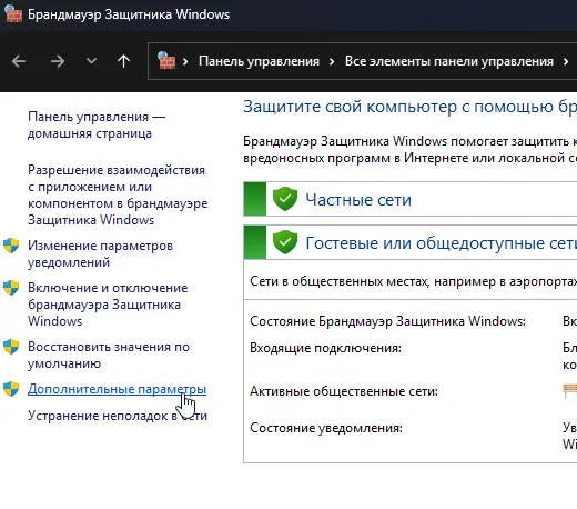 1. Откройте «Брандмауэр Защитника Windows» -> «Дополнительные параметры».