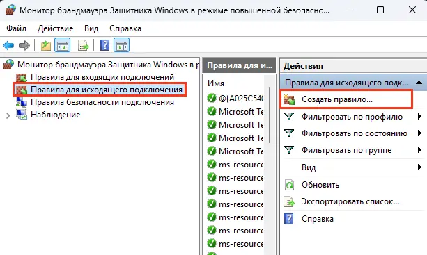 2. Выберите «Правила для исходящего подключения» -> «Создать правило».