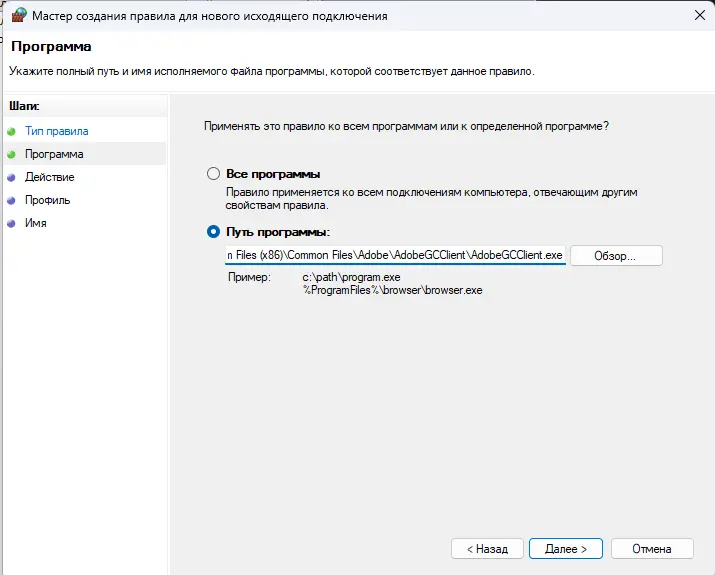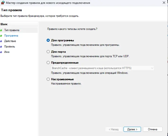 3. Тип правила: «Для программы».