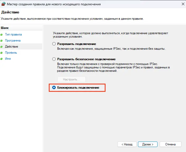 5. Выберите действие: «Блокировать подключение».