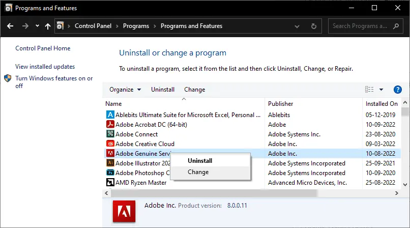 3. В списке установленного софта найдите строку Adobe Genuine Service.