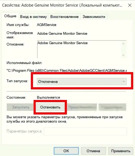 Теперь служба парализована. Даже если Adobe попытается её запустить, Windows заблокирует этот процесс.