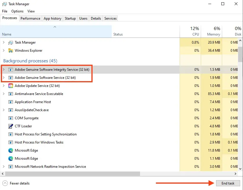 2. Откройте Диспетчер задач (Ctrl + Shift + Esc) и завершите процессы Adobe Genuine Software Integrity Service или AGSService.exe, если они висят в памяти.