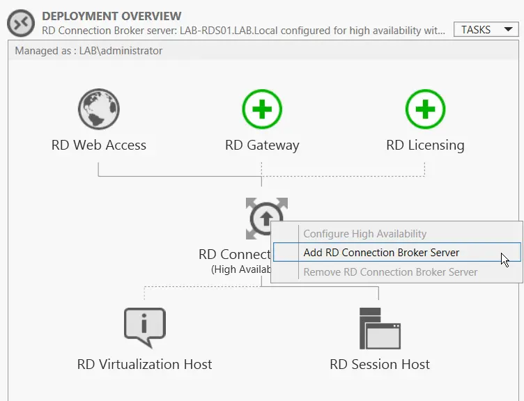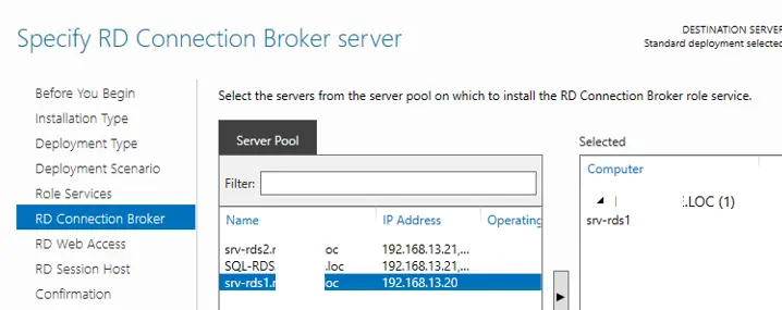 — На двух серверах через Server Manager → Remote Desktop Services добавьте роль RD Connection Broker на оба устройства.