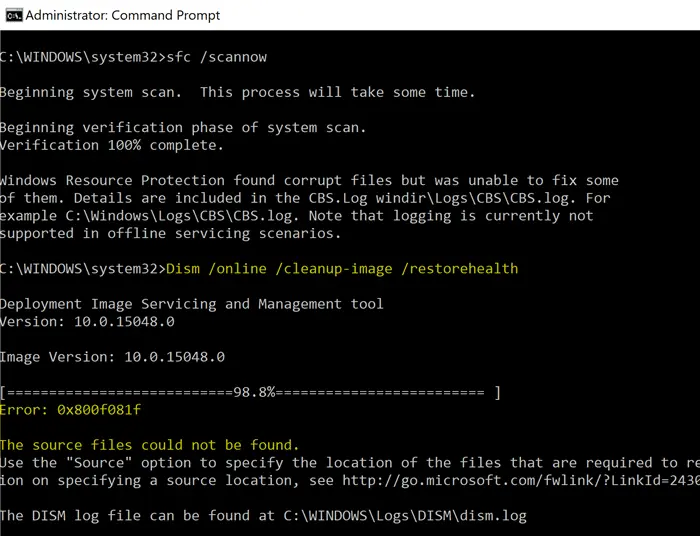 Когда DISM обнаруживает повреждение, которое не может быть устранено, он выдает ошибку, часто с кодом 0x800f081f, указывающим на невозможность найти исходные файлы для восстановления.