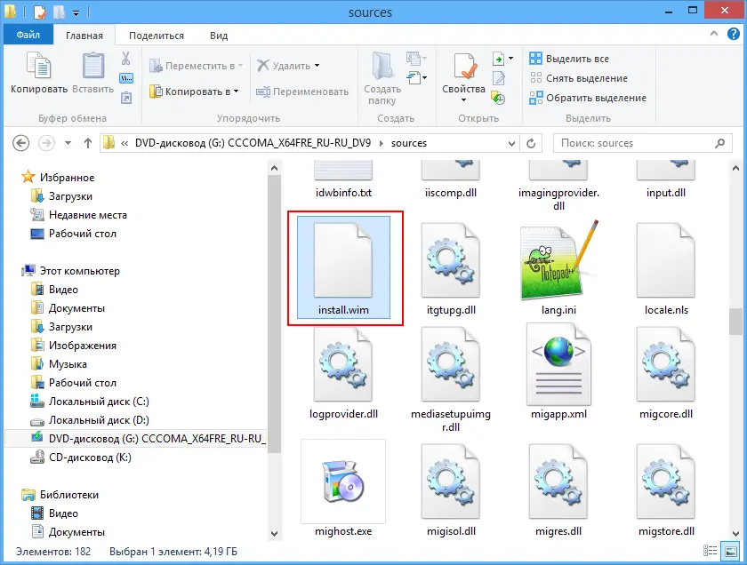 3. Внутри смонтированного диска найдите папку \sources и внутри нее файл install.wim (или install.esd).