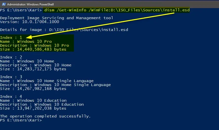 1. Определите индекс вашей версии (например, Windows 10 Pro или Home) внутри файла install.wim, используя команду (предположим, ваш ISO смонтирован как D:):