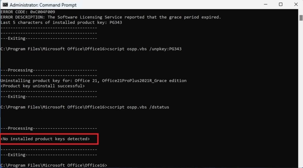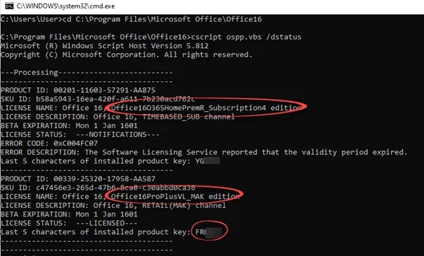 Скрипт ospp.vbs может не видеть ключи, если канал лицензирования установленного продукта не совпадает с типом ключа, который вы ожидаете увидеть. Например, в системе установлена лицензия «Grace Edition» (пробная), которая истекла и была удалена «чистильщиками», а основная лицензия так и не встала.