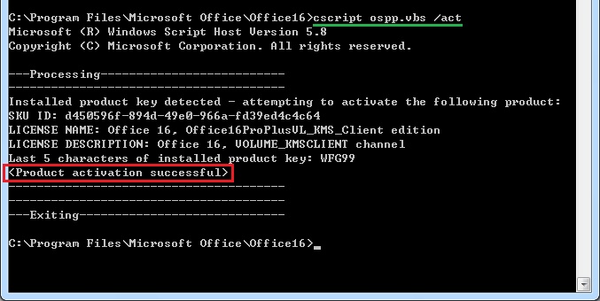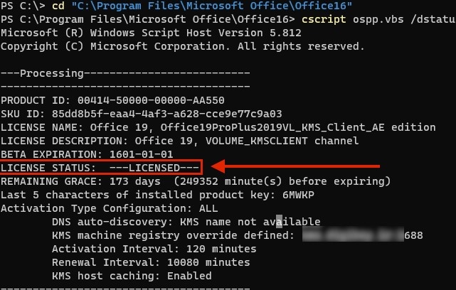 Использование легального ключа гарантирует, что команда ospp.vbs /act выполнится успешно и вы получите статус LICENSED.